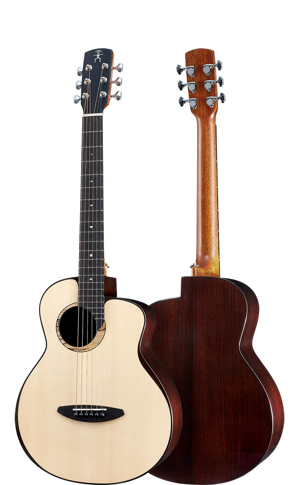 鸟吉他琴头造型,乌木贴片搭配白贝壳镶嵌aNueNue LOGO。使用德荣1:14齿轮比的封闭式弦钮,转动顺畅,能有效的校正音准。