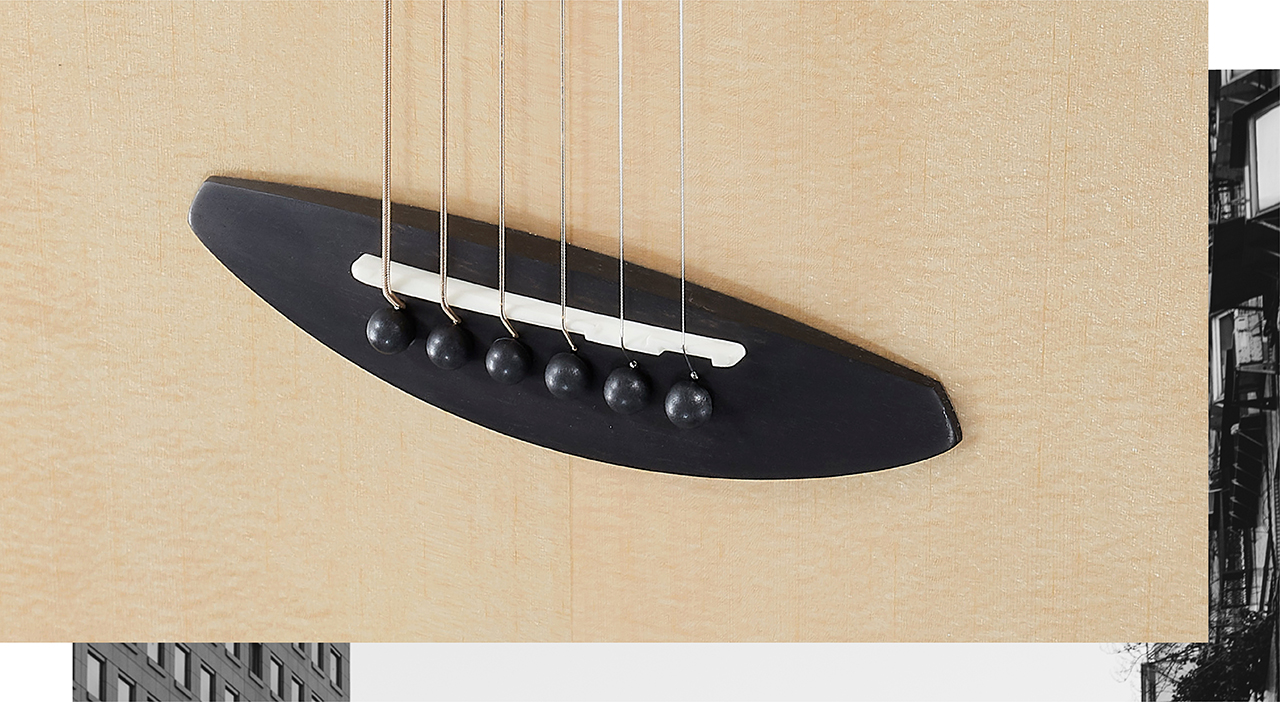 鸟吉他定制的造型琴桥,使用乌黑色泽的乌木,拥有紧密的木纹硬度,硬度更胜玫瑰木,能支撑琴的后段琴弦张力。搭配水牛骨弦枕,让琴的延音有力,且拥有纯净的音色,质地坚硬清脆,能有效的传导琴弦的共鸣。每一根弦都做了个别补偿,让琴能有更精准的音准。