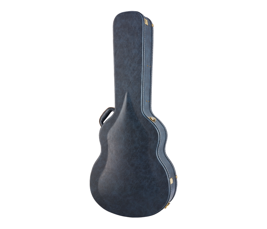 蓝色木制硬盒,由多层材质包覆制成,以坚硬的杨木为基底,外层由防水耐磨的合成皮革包覆,内层由防震与吸收潮气的防撞PU绵制成,厚度达2公分,由细致纤维的银色长毛绒包覆,防止琴面刮伤,让琴受到良好的保护。