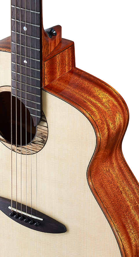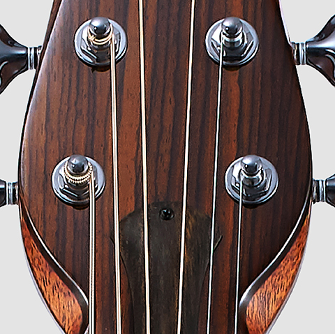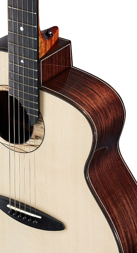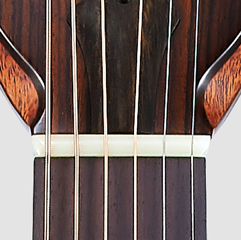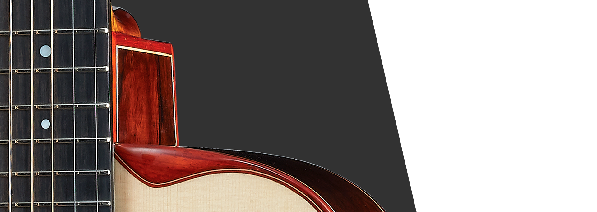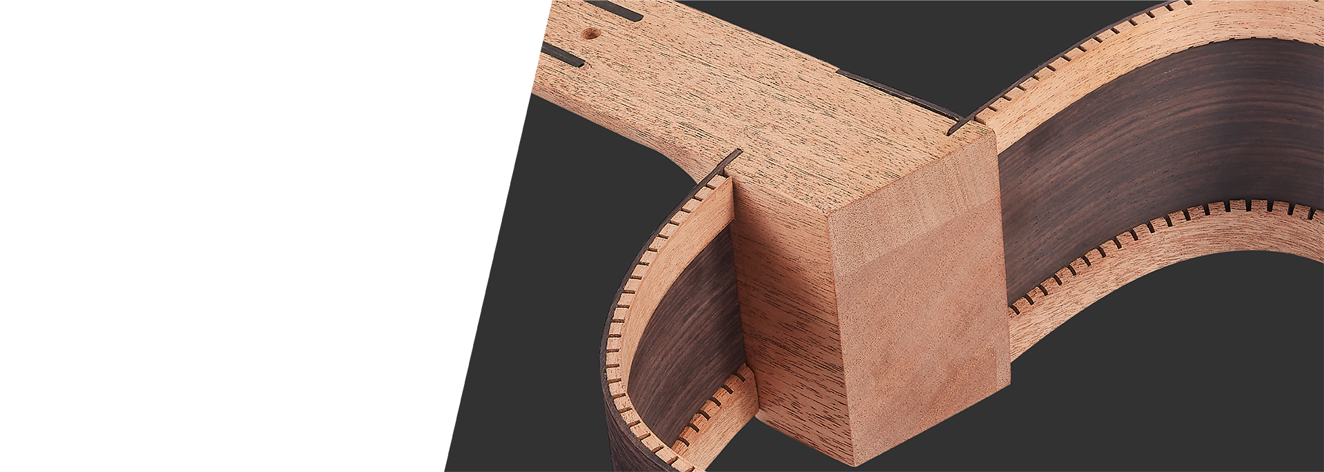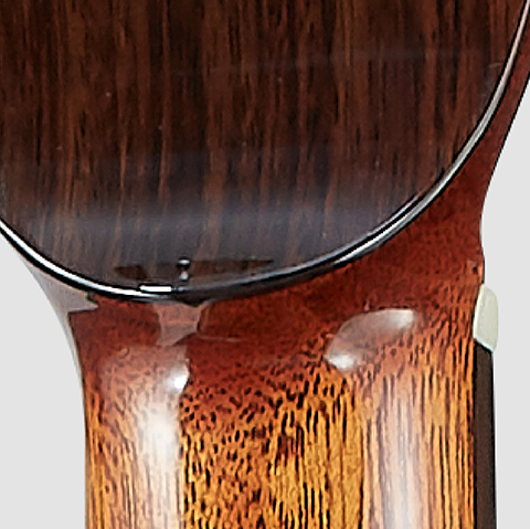 古典吉他常用的接柄工法。一体式的嵌入,可以确保结构的稳定性,坚固不易变形。并能充分传导声音的震动,增加共鸣与音色。