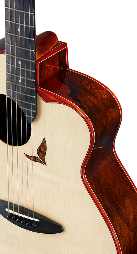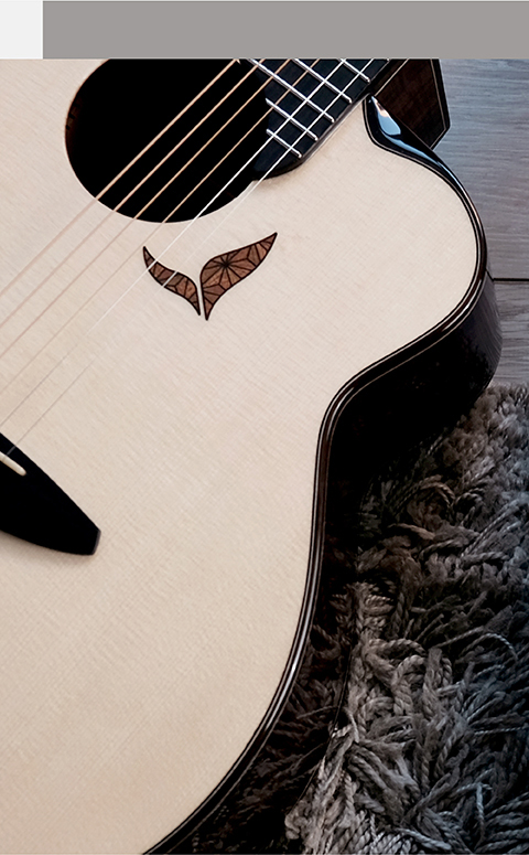 杉田健司为吉他未来系列“一体共振”空气的波动,拨弦后释放出来的波动,首先面板达到共振,可以和周边琴身,琴柄,琴头一层一层达到共振,而带动出美妙的音色。光透面板厚度控制在2.5mm,力木设计要能够稳定面板,防止变型和支撑弦的张力。经过三年来反覆的调校,做出清晰有弹性的音色,消除木头硬硬的音色。
