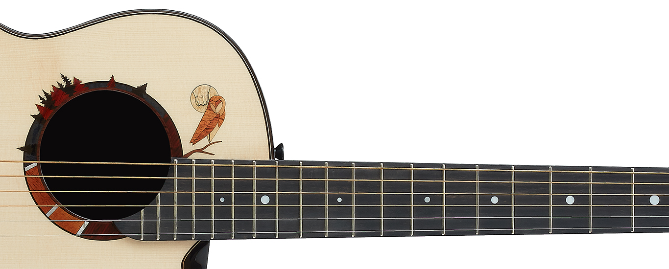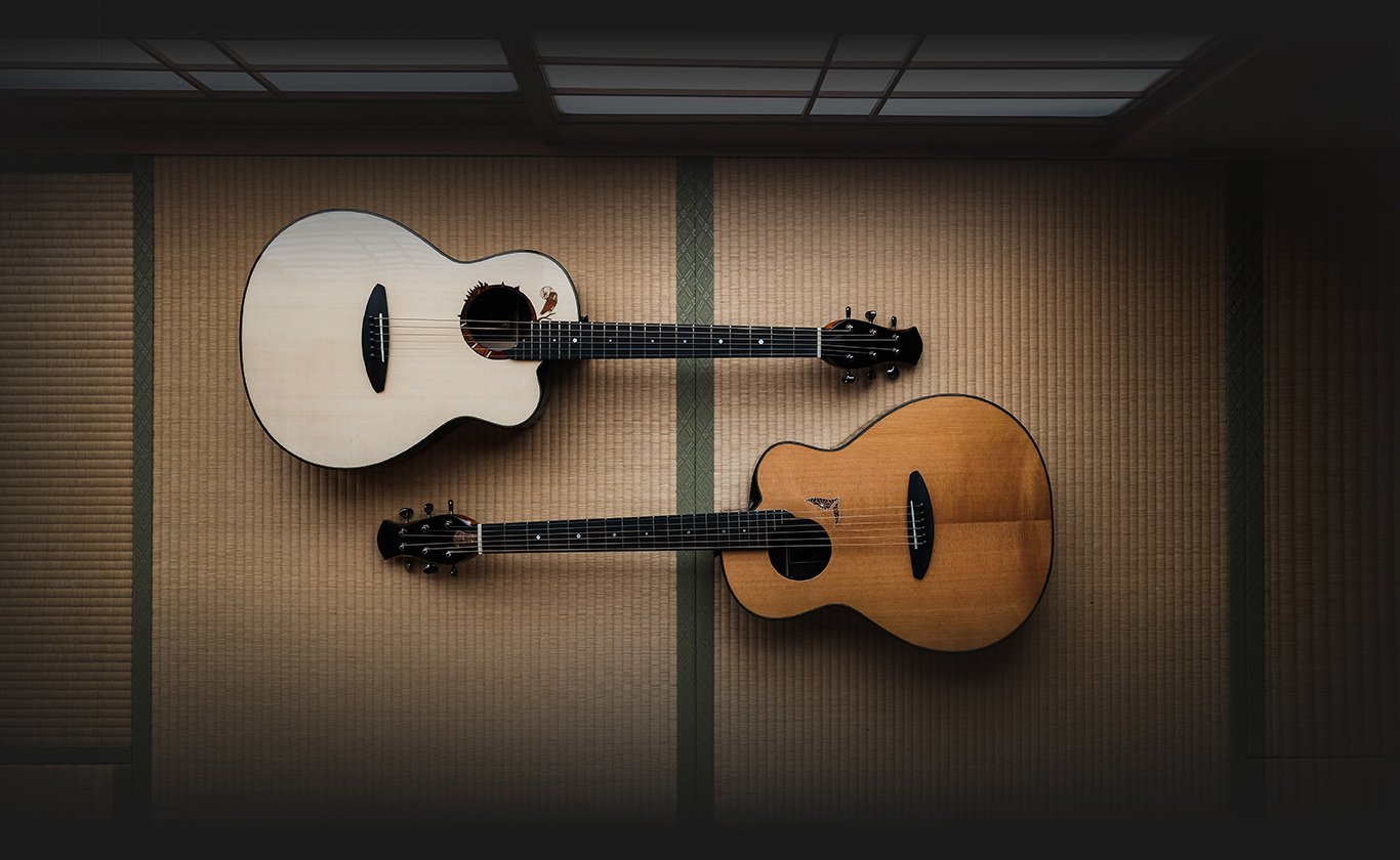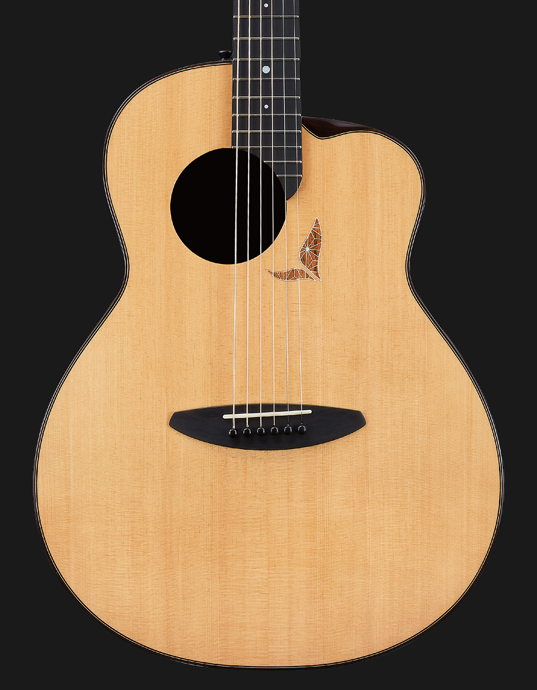 时间扭曲后碳化的月亮云杉面板颜色稍深,创造出宛如历经岁月洗礼的年代感,烘焙木材让质地更加稳定,暴露于气候变化时也更能抵抗热胀冷缩。保留手工制琴大师杉田健司aNueNue LS系列经典削切琴头与寄木细工的细腻设计,特殊跳色勾勒镶嵌轮廓线,让经典更添经典。