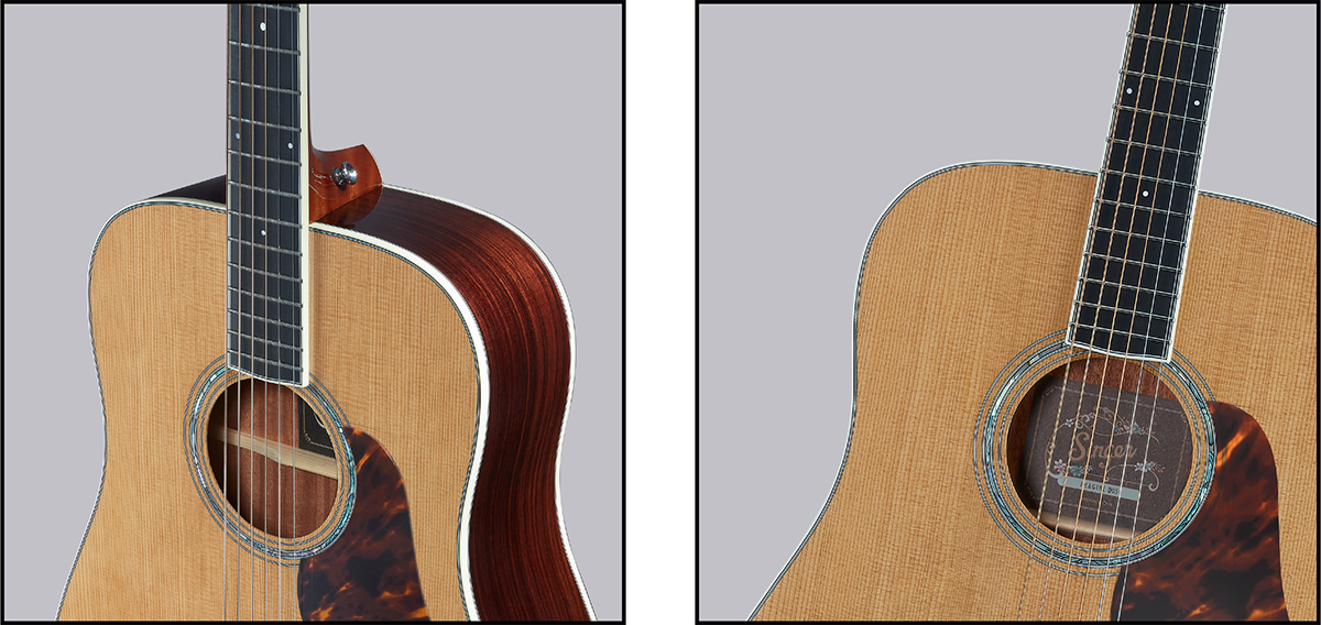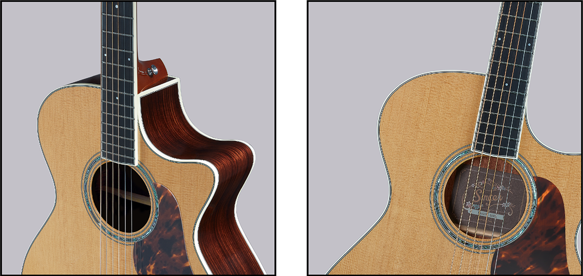 吉他的细节设计华丽但克制,琴身、指板与琴头的象牙白镶边,以及贝壳镶嵌的琴头 LOGO 和音孔花圈,完美融合了传统与创新。高光漆面提升了耐用性,并增添视觉上的精致感,使其成为编曲制作人、歌手及专业乐手在舞台上和录音室中的理想伙伴。