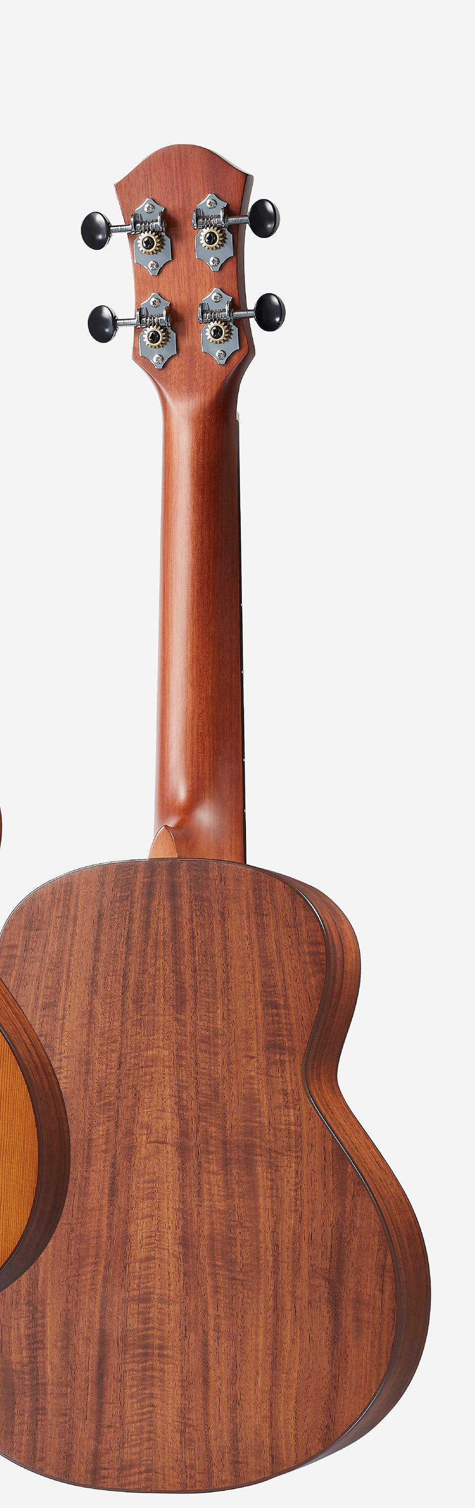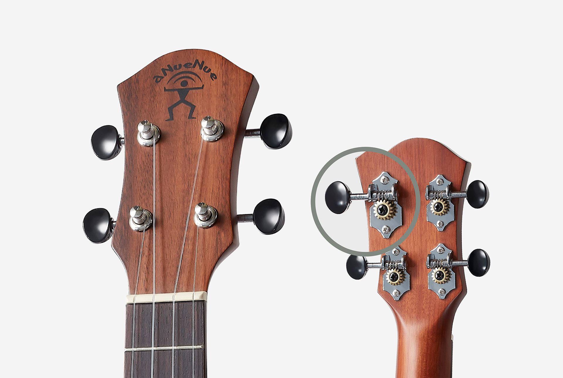 aNueNue 基本款琴头造型,相思木搭配特殊印刷的aNueNue LOGO。使用德荣1:16齿轮式弦钮,转动顺畅,能有效调整细微的音准。