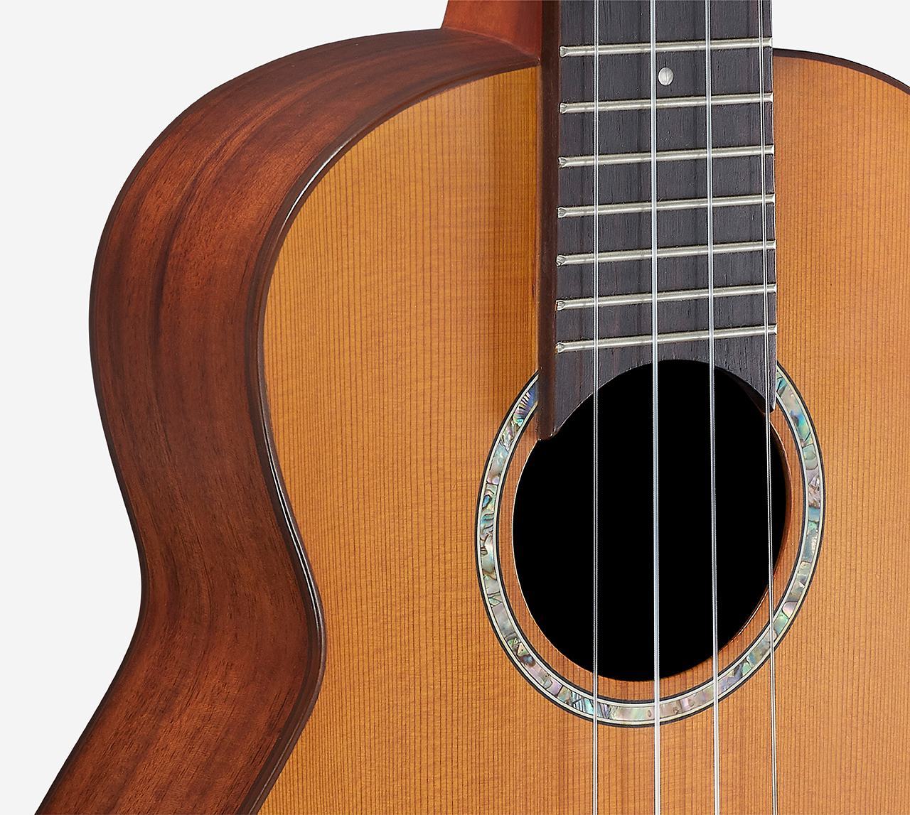 红松木拥有明显的直纹路,视觉上颜色较云杉木暗且偏红,质地软,是种渲染力高的木材,带有穿透性的中频。新琴期间音量就能发挥得非常好,音色温暖厚实,轻触弦的技巧都能有较好的表现。