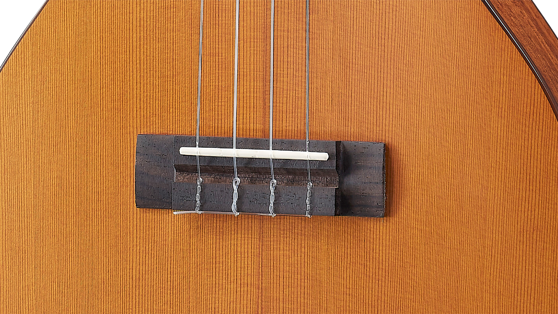 琴桥使用硬度较高的玫瑰木,方形造型增加与琴面的接触,能更支撑琴的后段琴弦张力。搭配质地坚硬清脆的合成牛骨弦枕,能有效的传导琴弦的共鸣。