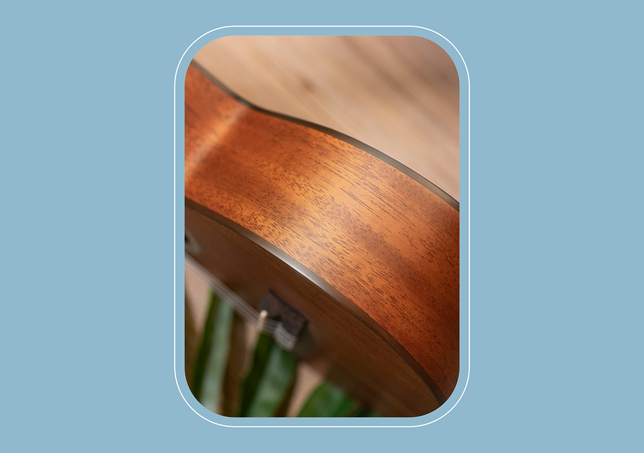 桃花心木,纹路较直,质地坚硬重量轻,声音传导较快,音色清脆高亮。弹奏时高频较有颗粒感,低频的呈现较温暖丰富。 合板木材音色稳定,坚硬不易弯曲变形的特性,较不受气候与湿度变化影响,能适应劣质的环境。中层使用白杨木,维持木头之间良好的传导之外,能有效减轻重量。