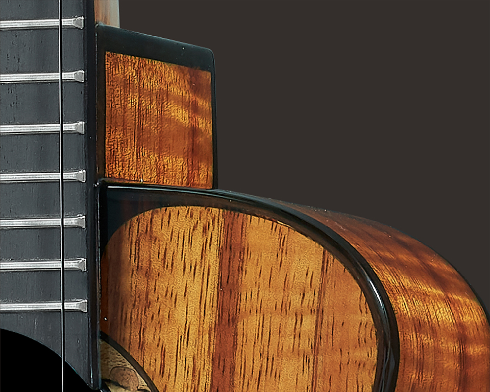 以玫瑰木材质做"阴晴圆缺"的设计,镶嵌于琴身外侧,其密度高又坚硬的木头,是视觉与保护实用性兼具的好材质。