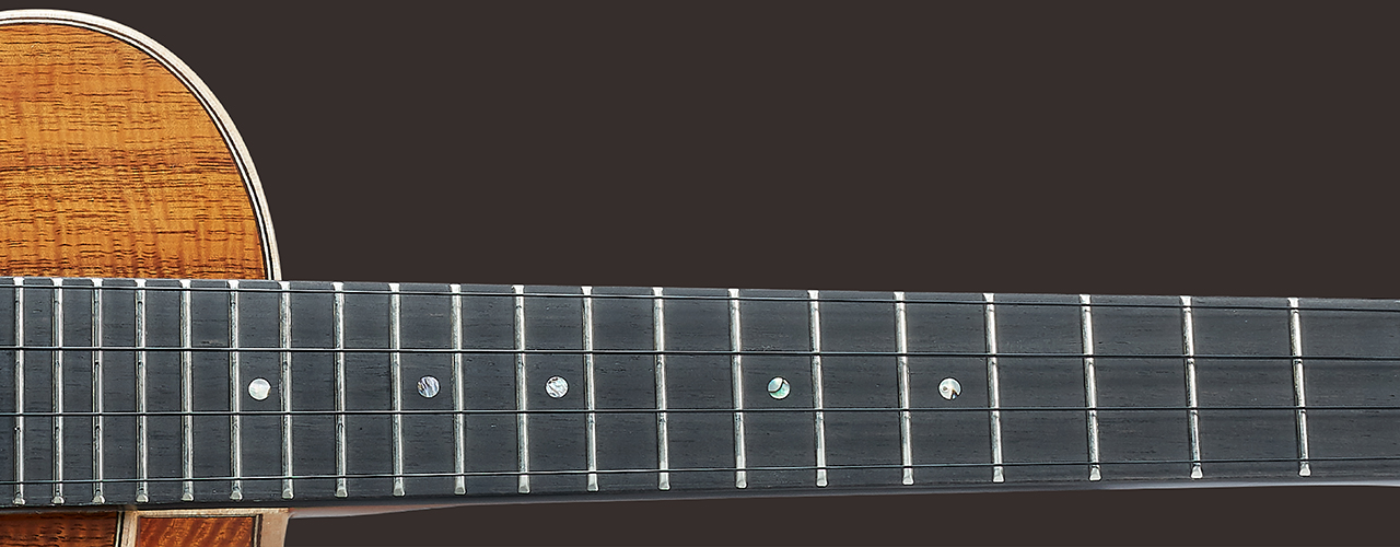 指板使用乌黑色泽的乌木,拥有紧密的木纹,硬度更胜玫瑰木。乌木的传导特性,将高频更加地显现出来。 44mm的琴颈宽让持琴手感更加舒适。经过抛光、打磨、倒角、去毛刺等多种细节程序处理,让持琴手感更加舒适。指板点镶嵌贝壳心。