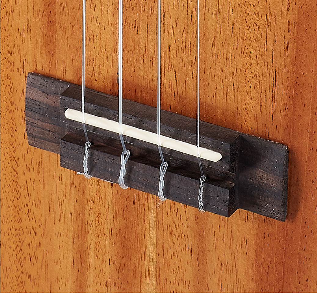 方形造型增加琴桥与琴面的接触面积,使用硬度较高的玫瑰木,更能支撑后段琴弦的张力。搭配的水牛骨弦枕,质地坚硬,有效的传导琴弦的共鸣。