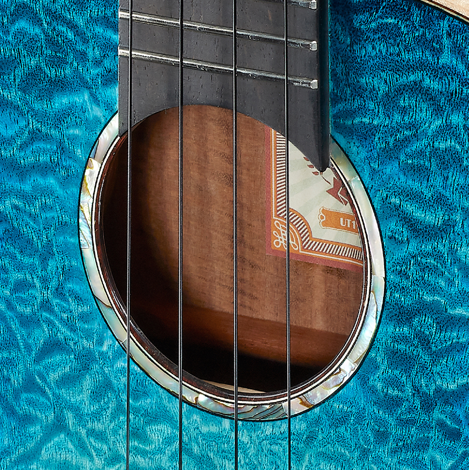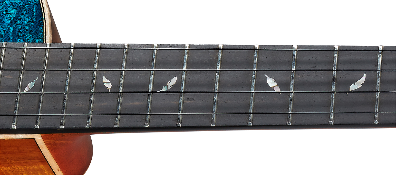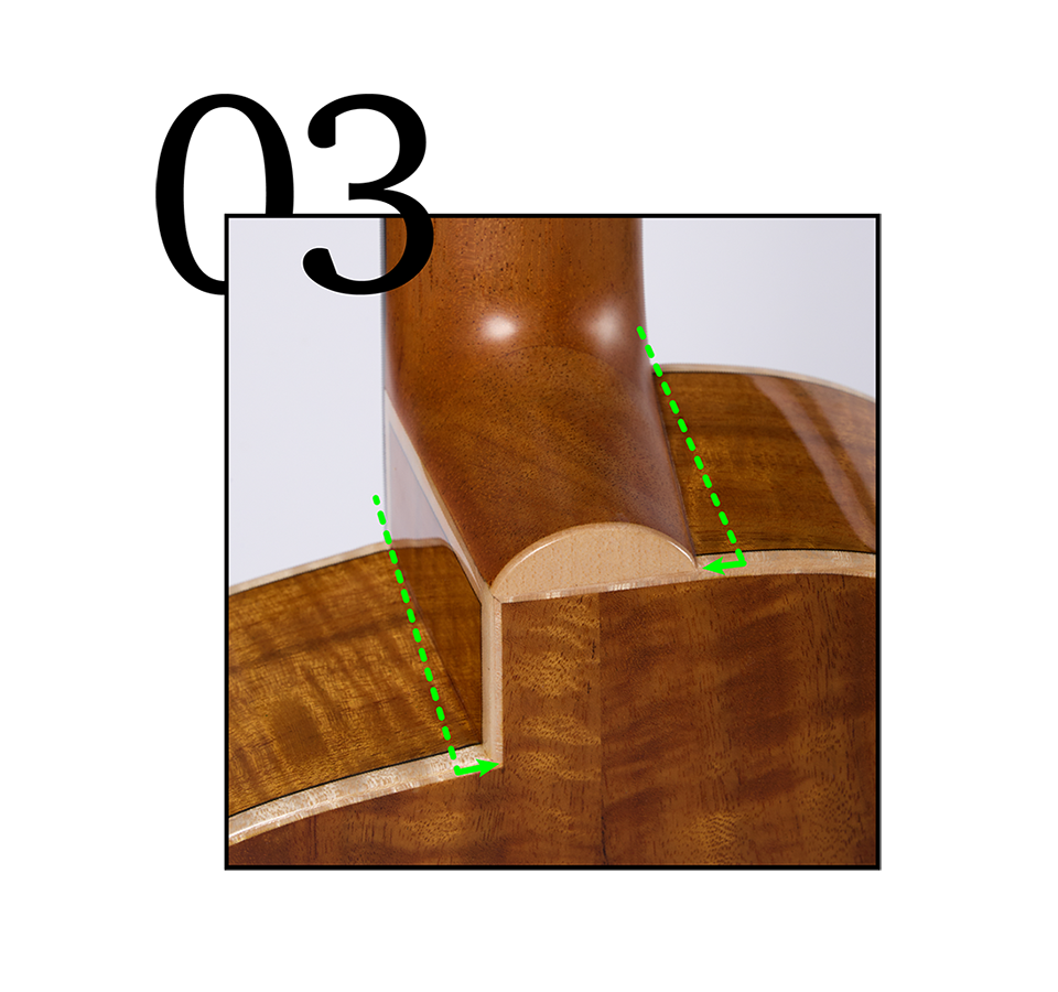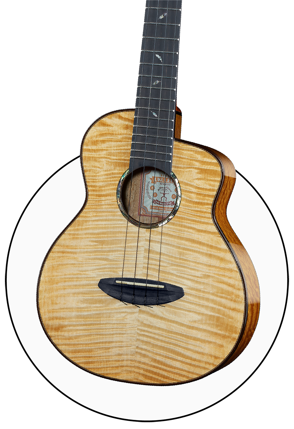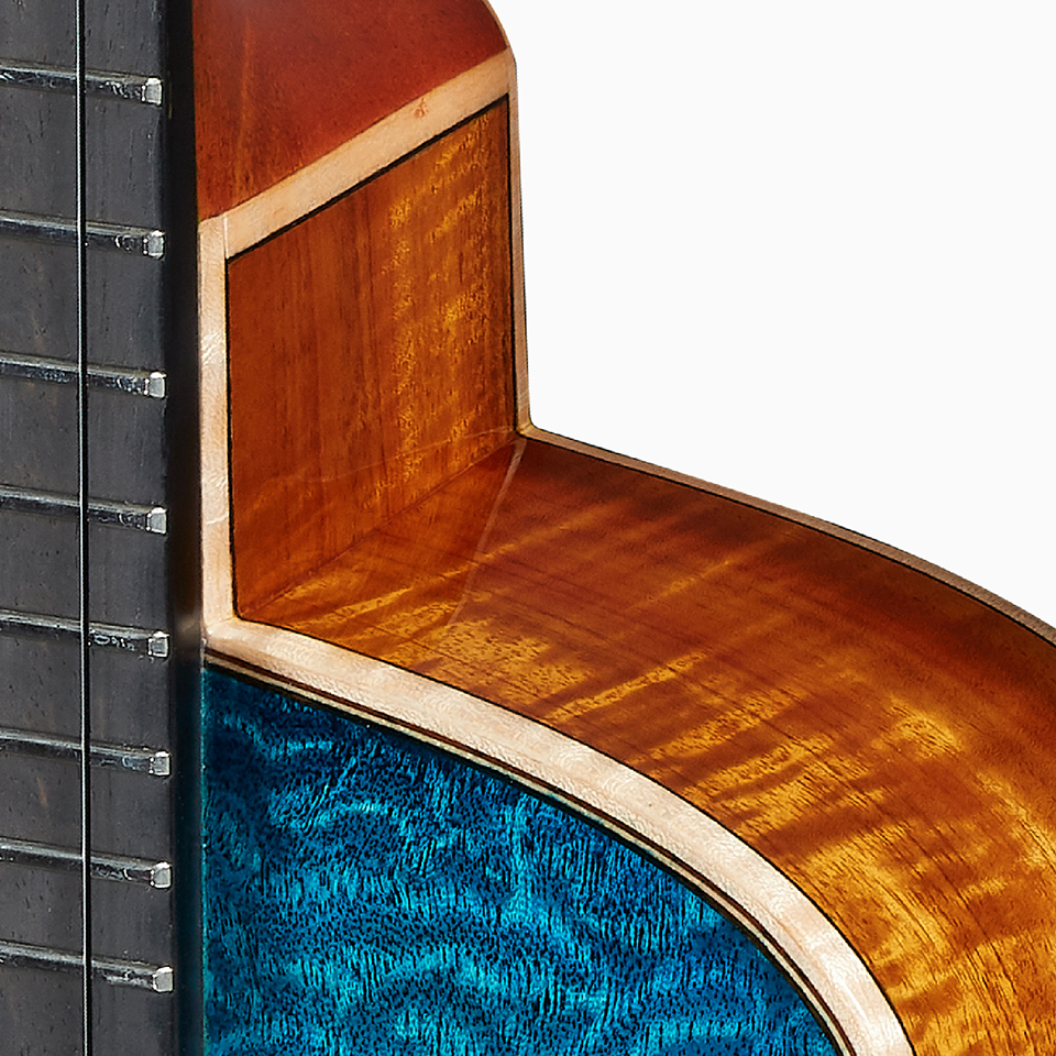 虎纹枫木镶嵌琴身外侧,虎纹枫木是一种密度高又坚硬的木头,木纹紧密,色泽丰富细腻,是视觉与保护实用性兼具的好材质。