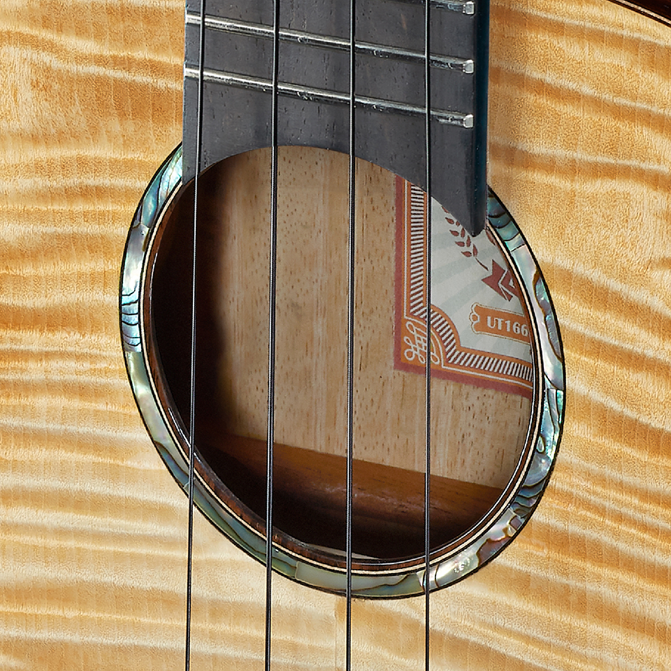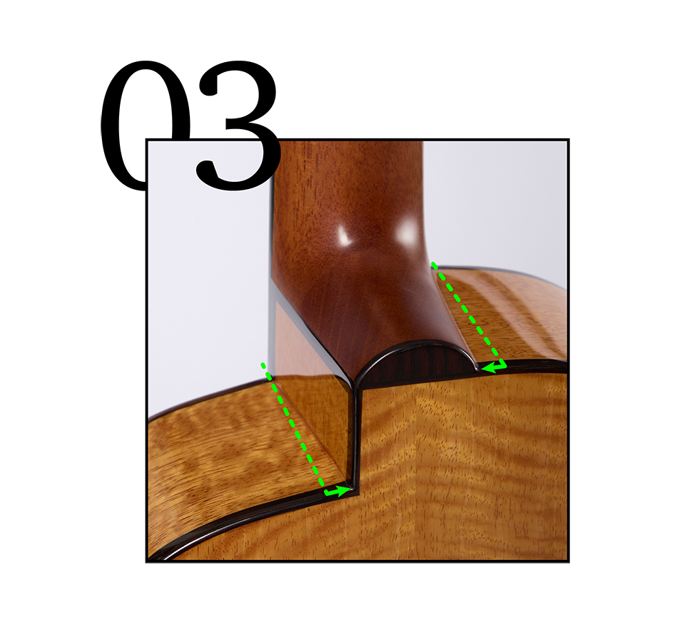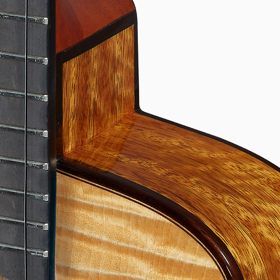 玫瑰木密度高、结构稳定不易脆裂变形。镶嵌琴身外侧,不仅给予琴身保护,稳重的视觉质感也为琴身勾勒出温润而沉稳的轮廓。